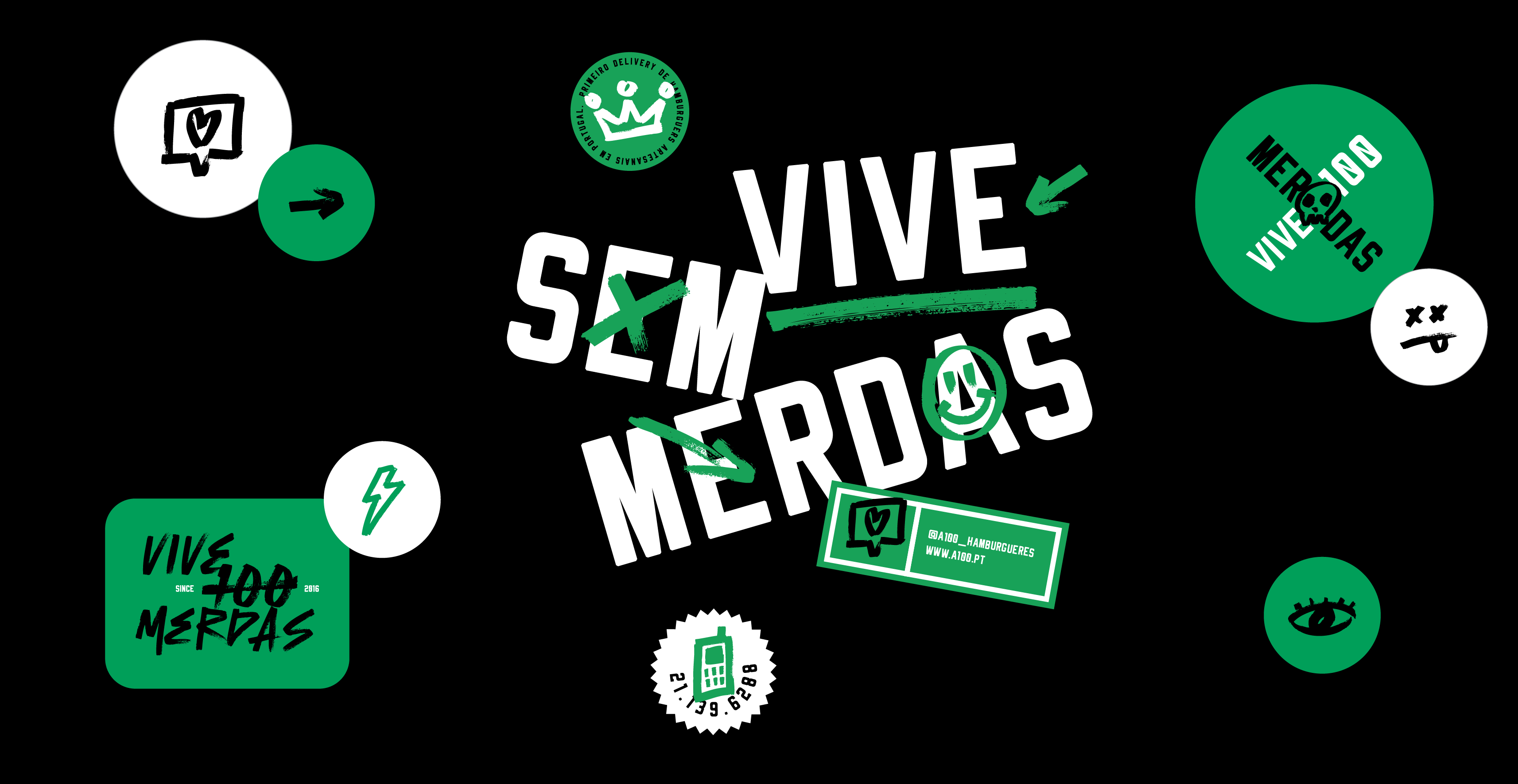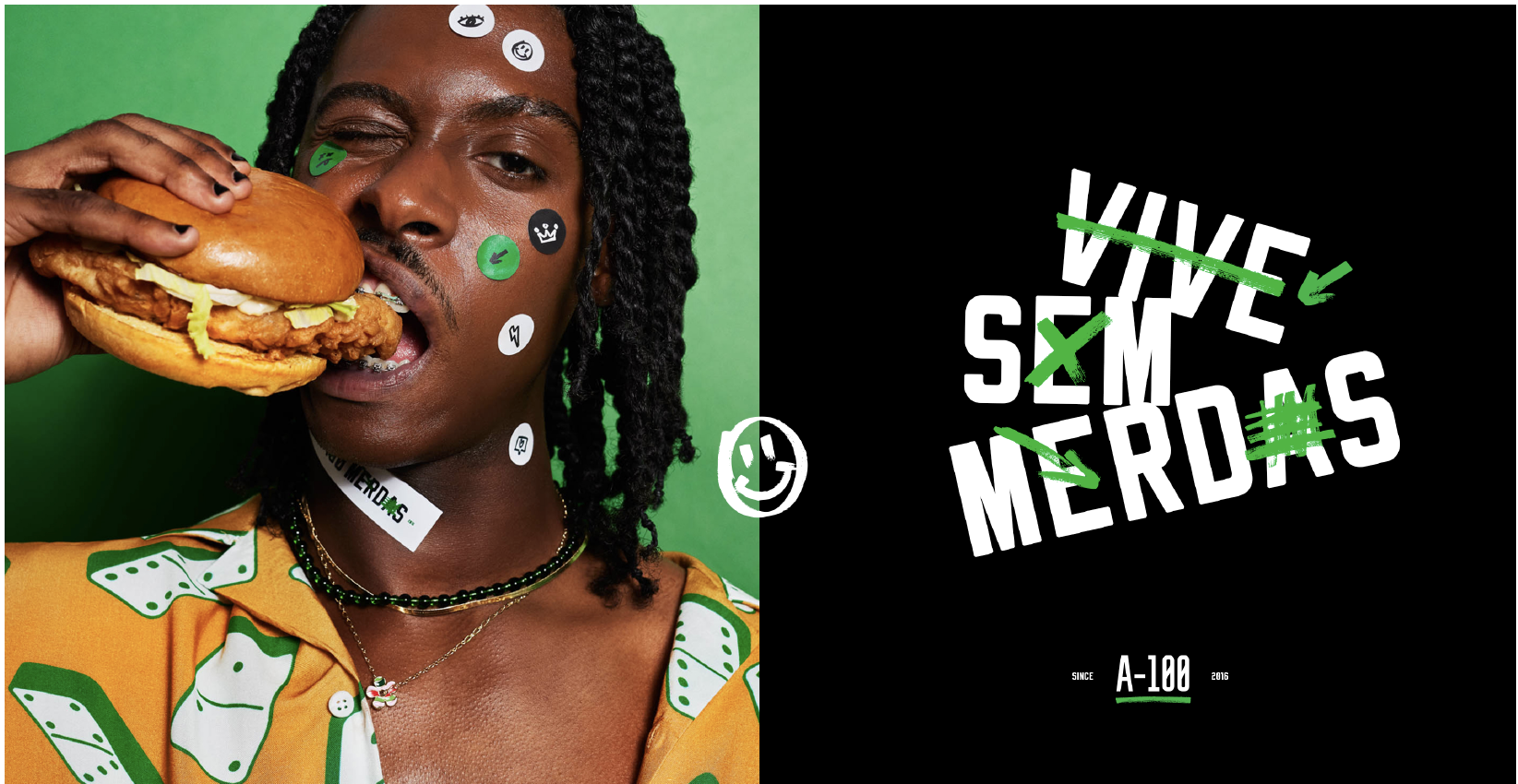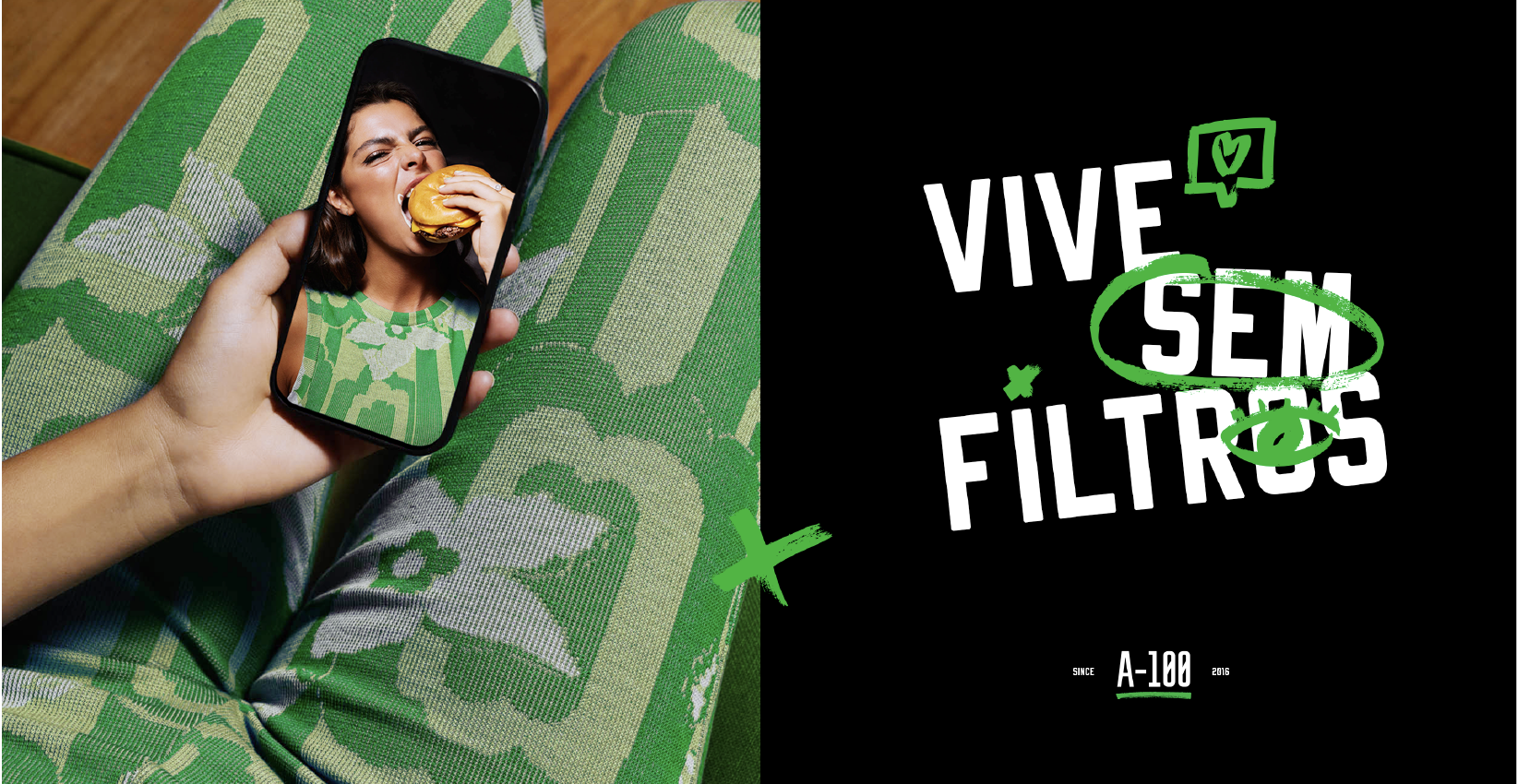 We've undergone a repositioning journey for the brand we've nurtured from the beginning, A-100, with the aim of connecting with a more edgy digital audience. The result is our new communication concept: “Vive 100 merdas”, a pun that explores different meanings of the words “hundred” and “without” in Portuguese, which sound alike but have different meanings.